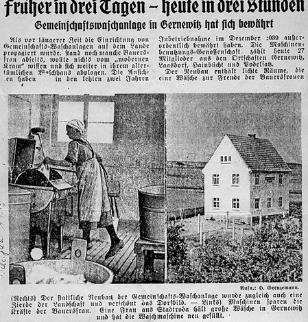 1939: | Inbetriebnahme Gemeinschaftswaschanlage unter Leitung der Molkerei (siehe Station → Beteiligung 27 Partner aus Gernewitz, Laasdorf, Hainbücht und Podelsa → Ausstattung: 2 Waschmaschinen, Trockenschleuder, Trockenraum, Großrolle und Plätteisen → Dienstwohnung darüber für den Heizer der Wäscherei |