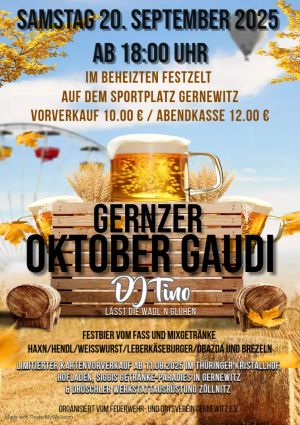 endlich ist es wieder soweit! Am 20. September ab 18 Uhr laden wir, der Feuerwehr- und Ortsverein Gernewitz, euch herzlich zur Gernzer Oktober Gaudi ein. Macht euch bereit für einen unvergesslichen Abend voller Spaß und guter Laune!